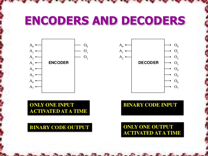 인코더는 2의 n승 비트의 입력을 n비트로, 디코터는 n비트의 입력을 2의 n승 비트로 출력한다.